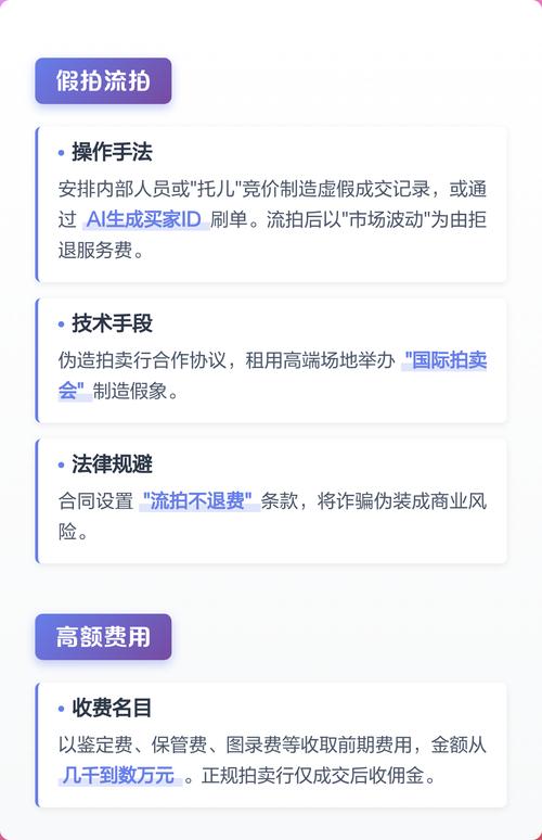 - 案例: 受害者被拉入一个“高端艺术品投资群”,群里有“专家”实时点评市场行情,并分享一些“内部消息”,一段时间后,群主会推荐一个“海外回流”的官窑瓷器或名家书画,并附上精美的图片和“权威”鉴定报告,受害者购买后,诈骗分子会提供一个所谓的“国际拍卖公司”链接,要求缴纳高昂的“上拍费”和“保证金”才能进入拍卖流程,藏品流拍,保证金也以各种理由被克扣或无法退还。
