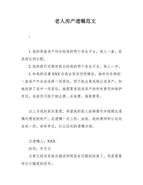 - 内容清晰明确:写明您的个人信息(姓名、身份证号)、对财产的详细描述(地址、房产证号、存款账号等)、指定继承人的姓名及与您的身份关系、以及您处理这些财产的意愿。