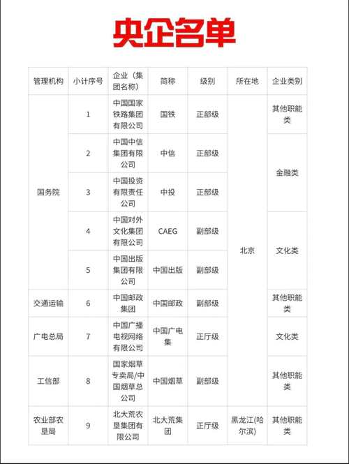 这是国家投资企业的最高层级,由国务院国有资产监督管理委员会(国资委)直接履行出资人职责,它们通常是规模巨大、技术领先、对国家战略至关重要的企业集团。