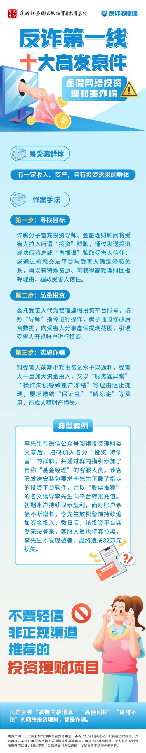 - 警惕“杀猪盘”式诈骗:很多理财诈骗始于情感诈骗(杀猪盘),骗子会先和你建立恋爱关系或朋友关系,获取你的信任,不经意”透露自己在某个平台赚了大钱,并“好心”带你一起赚钱,一旦你投入资金,平台就会关闭,骗子也会消失。