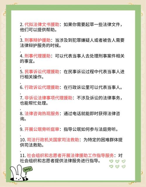 - 民事领域:婚姻家庭(离婚、财产分割、抚养权)、继承、劳动争议(工资、工伤、辞退)、交通事故、消费纠纷、房产买卖、合同纠纷、债务问题等。