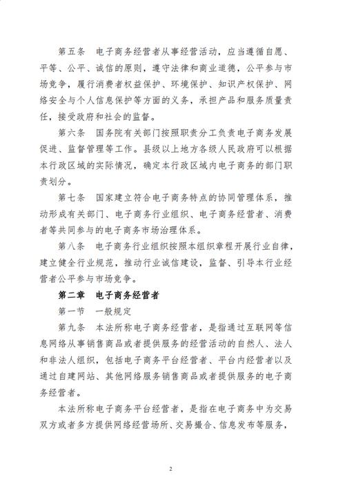 - 电子商务经营者的定义与义务:明确了电子商务经营者(包括平台内经营者、自建网站经营者、社交/直播电商等)的法律地位和必须履行的义务,如亮明身份(公示营业执照、行政许可信息)、保障交易安全、保护个人信息、明码标价、禁止搭售等。