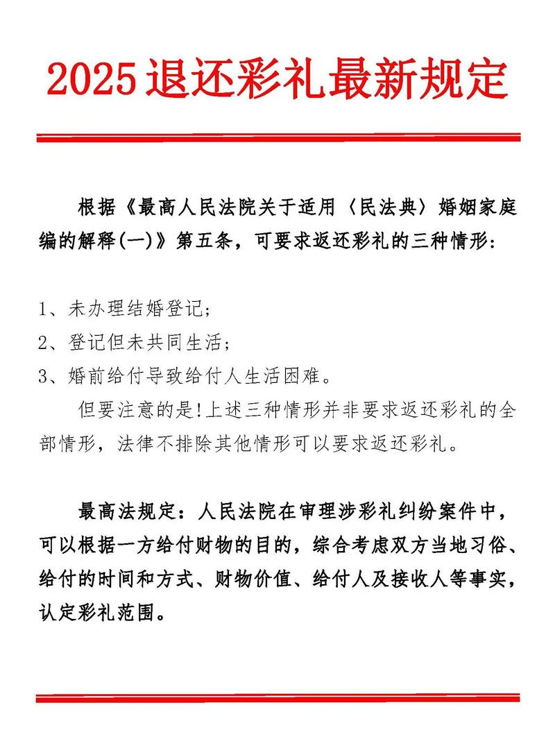 以下是2025年(以及至今)法律对彩礼处理的核心规定,主要依据是《最高人民法院关于适用〈中华人民共和国婚姻法〉若干问题的解释(二)》(以下简称《婚姻法解释二》),该解释于2004年4月1日起施行,在2025年依然有效。