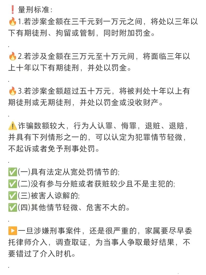 - 诈骗数额(“数额较大”、“数额巨大”、“数额特别巨大”)。
