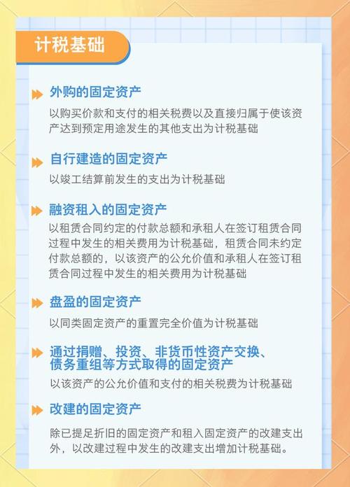 - 计税基础: 固定资产的计税基础是其历史成本,扣除按照税法规定计提的累计折旧(或摊销)和减值准备后的金额。