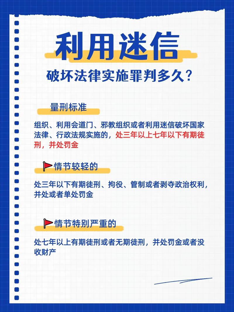 (图片来源网络,侵删)组织和利用会道门、邪教组织或者利用迷信破坏国家法律、行政法规实施的,处三年以上七年以下有期徒刑,并处罚金;情节特别严重的,处七年以上有期徒刑或者无期徒刑,并处罚金或者没收财产。
