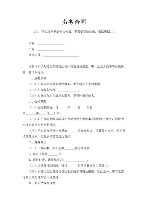 - 注意税务处理:劳务报酬的税务处理与工资薪金不同,通常由支付方(甲方)代扣代缴个人所得税,合同中应明确税费承担方式。
