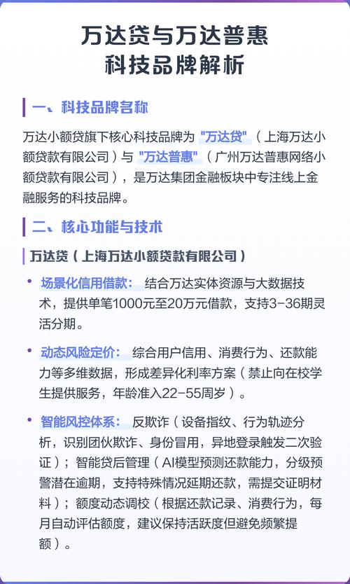 - 运营主体: 万达普惠(北京)融资服务有限公司,这是万达旗下持有消费金融相关牌照的核心平台,专注于为个人提供小额、无抵押的消费贷款。