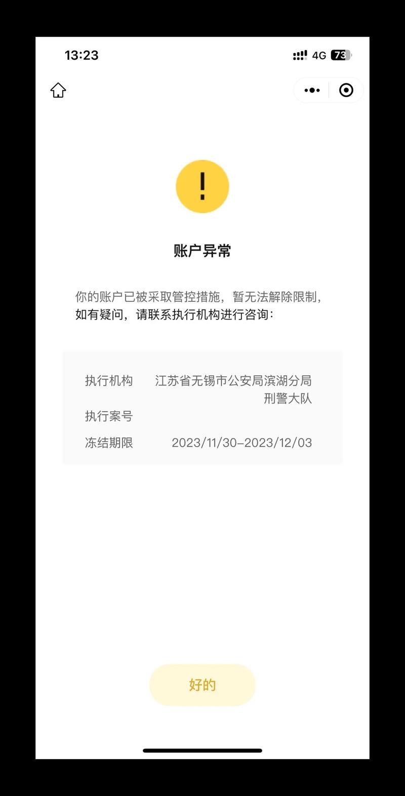 - 原因:与银行类似,支付机构的反诈系统监测到异常交易,或接到了公安机关的协查通知。