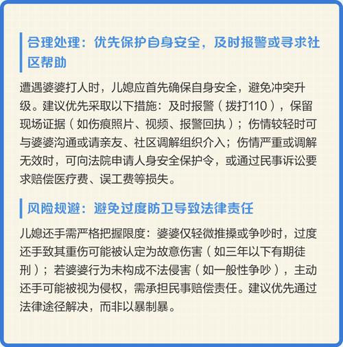 - 适用情况:如果儿媳妇的殴打行为是长期、一贯的,并且情节恶劣(如经常性打骂、冻饿、强迫从事过度劳动等),就可能构成虐待罪,需要注意的是,虐待罪通常是“不告不理”的自诉案件(需要婆婆自己去法院起诉),但如果导致婆婆重伤、死亡,则转为公诉案件,由公安机关主动侦查。