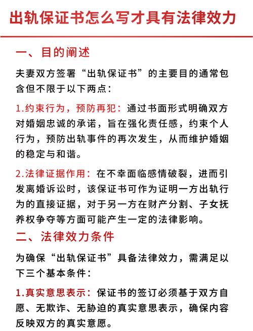 - 在感情或家庭纠纷中,一方可能会写下“保证出轨”、“保证家暴”等内容的保证书,这类保证书如果被用作离婚诉讼中的证据,虽然其“保证”行为本身可能不合法,但可以作为证明过错方存在不当行为的间接证据,对财产分割和子女抚养权判决可能产生不利影响,法院不会依据保证书去惩罚过错方,但会采信其反映的事实。