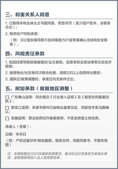 - 在极少数情况下,可能需要提交《业主一致同意书》、《承诺书》等材料给相关部门备案。