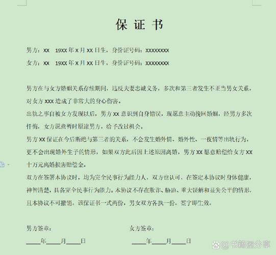 - 如果一方确实有出轨、家暴等过错,在诉讼中,这份保证书可以作为无过错方请求多分财产的有力证据,证明对方存在过错,从而影响法官的裁量,它不能直接决定财产归属,但能产生间接的法律效果。