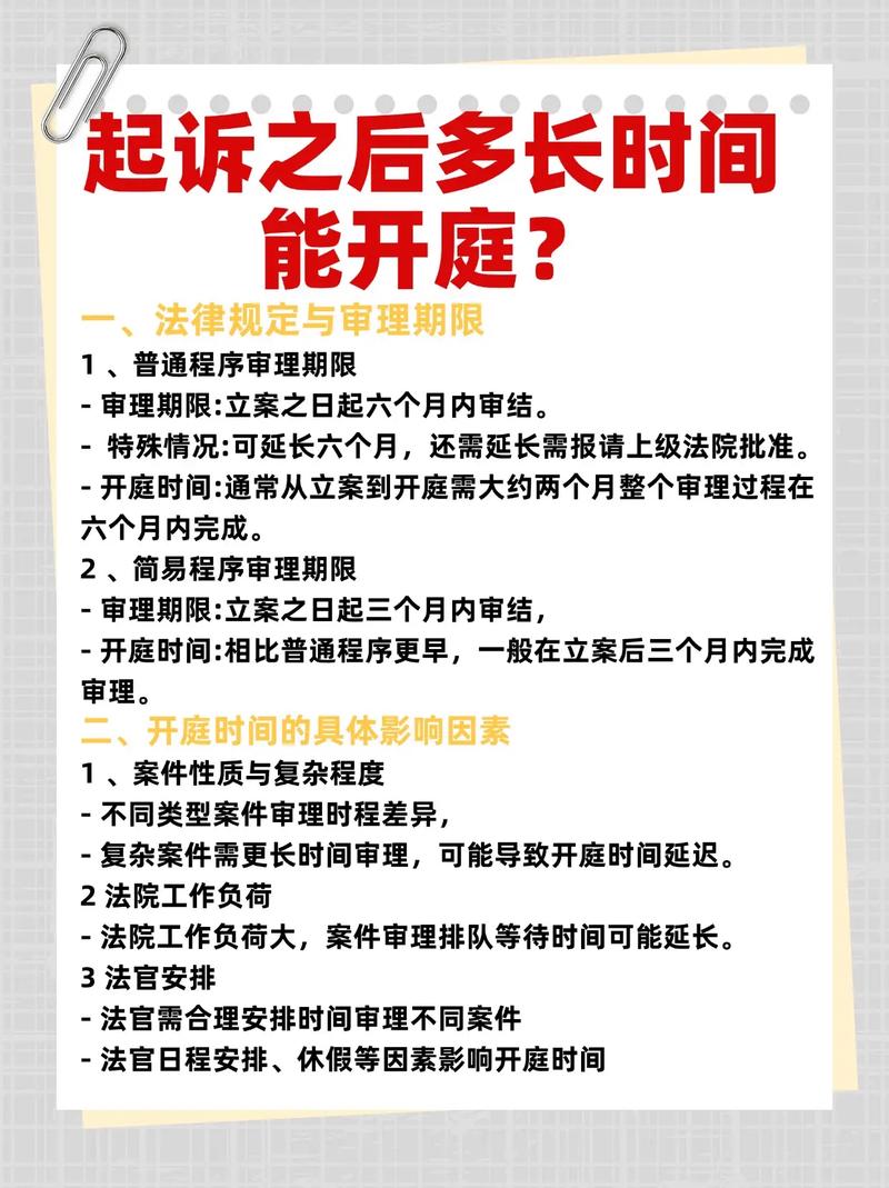 - 开庭排期: 法官和律师的时间需要协调,可能需要等待数周甚至数月。