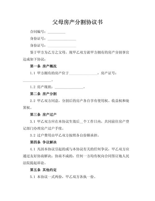 - 内容清晰具体:协议中应明确写明房产的详细地址、面积、产权证号、分割方式(谁获得哪套房子,谁获得现金补偿,补偿金额多少等)。
