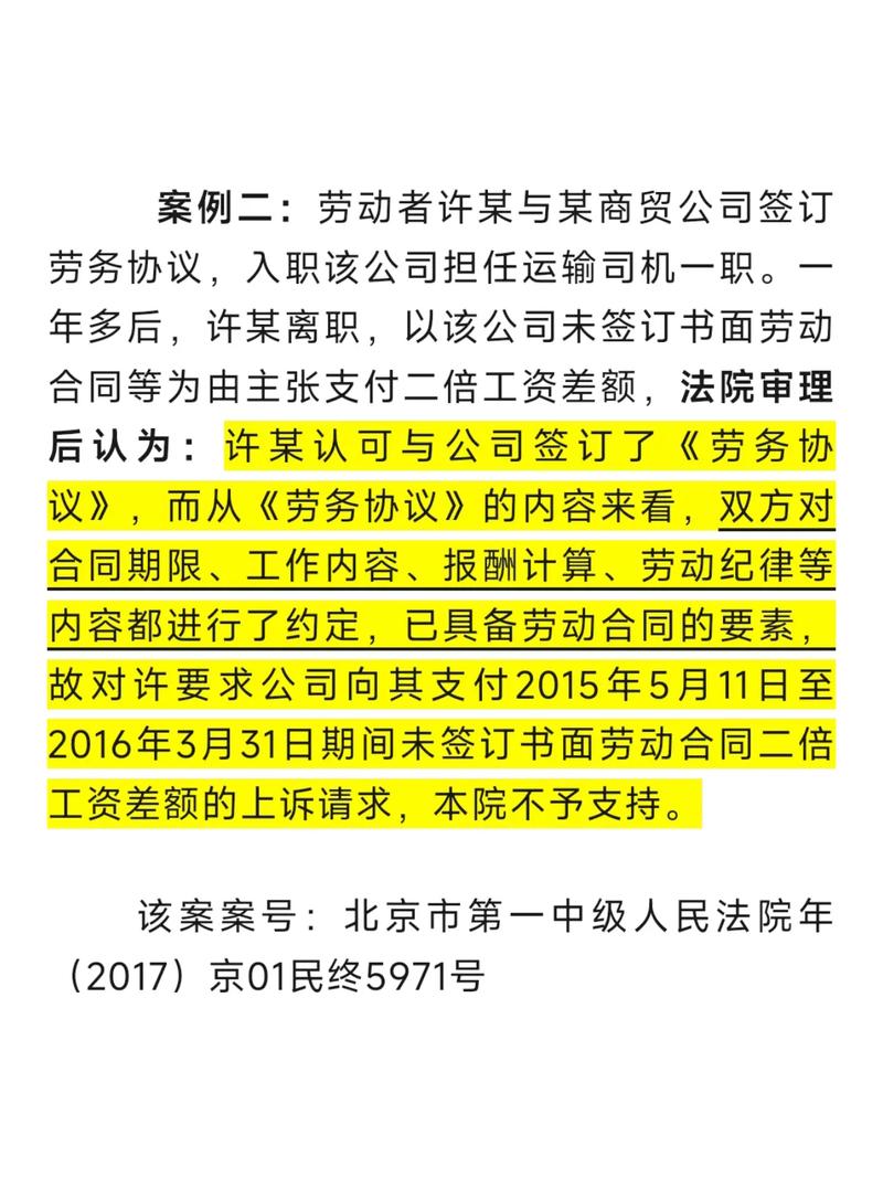 律师提醒:判断是劳务合同还是劳动合同,不能仅看合同名称,而应结合实际用工情况(如是否接受管理、工作安排、考勤等)综合认定,即使签订了“劳务合同”,但若符合劳动关系的特征,仍可能被认定为事实劳动关系,从而适用劳动法。
