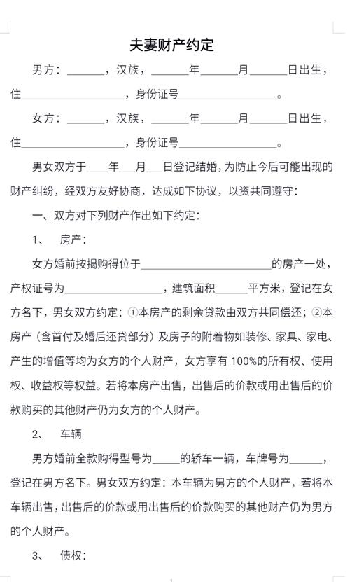 - 财产约定部分:协议中关于财产分割、归属的约定,只要是双方真实意愿的体现,且不损害他人(如债权人)的利益,通常是有效的,可以约定婚前的某套房归一方所有,也可以约定婚后的工资收入各自归各自所有。