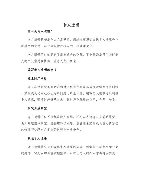 - 签名:在遗嘱全文的末尾,由老人亲笔签名。