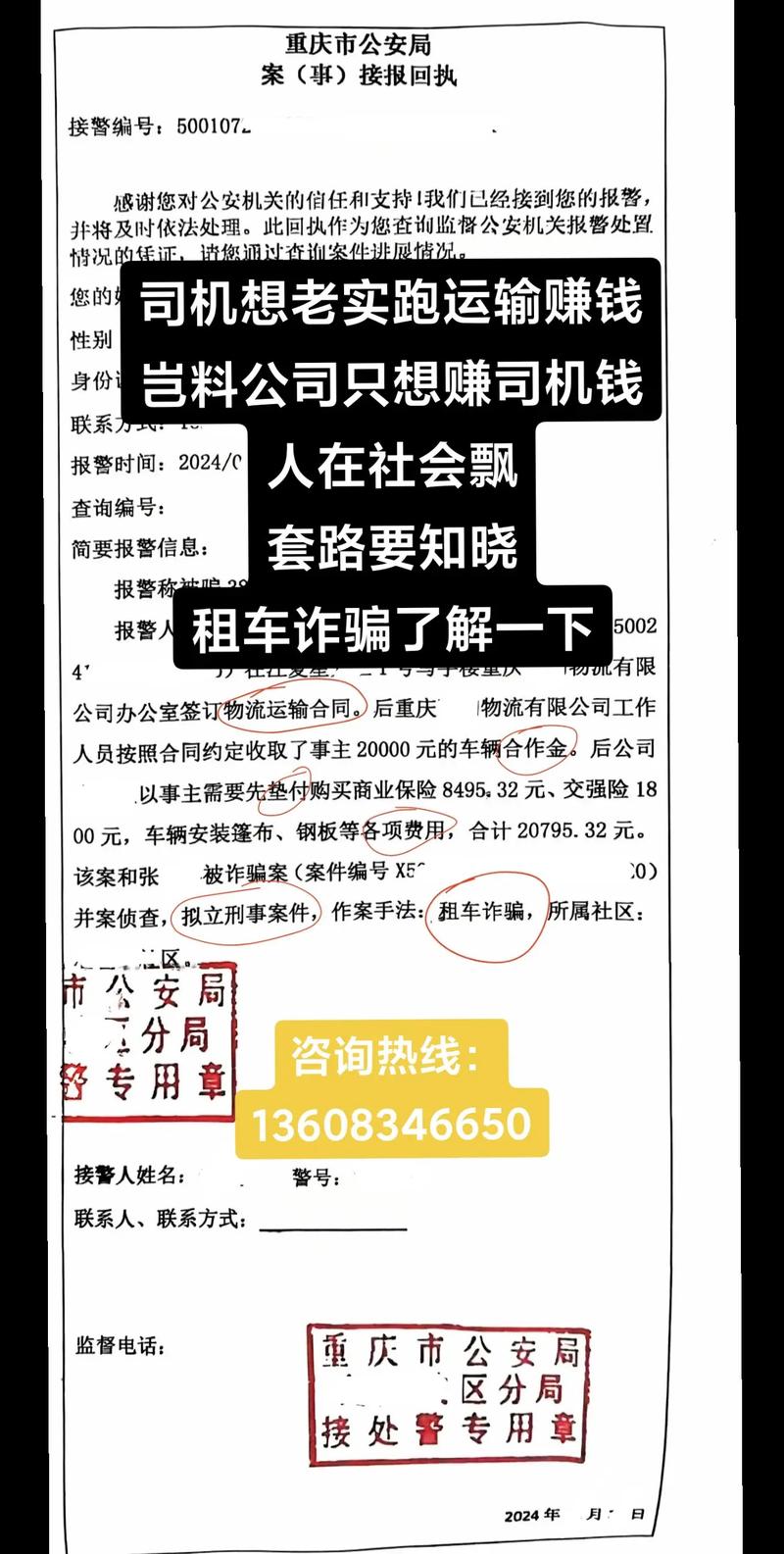 - 及时报警:如果发现被骗,应立即向公安机关报案,并尽可能提供租车合同、付款凭证、车辆信息等证据,同时通知租车公司。