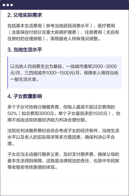 - 赡养人的数量:如果有多个子女,通常由所有子女共同承担,可以平均分担,也可以根据各自的经济能力进行约定或由法院判决按比例分担。