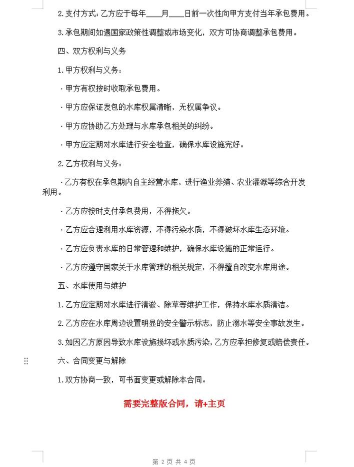 - 协商与签订承包合同:与发包方就合同条款进行充分协商,达成一致后签订正式的《水库承包经营合同》。