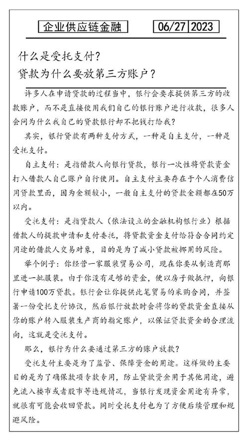 受托支付是商业银行个人贷款和部分公司贷款业务中的一种支付方式,根据规定,单笔贷款金额超过一定额度(如个人贷款通常为50万元人民币)时,贷款资金应采用受托支付方式,即银行不直接将钱支付给借款人,而是根据借款人的提款申请和支付委托,将贷款资金支付给符合合同约定用途的借款人交易对手。