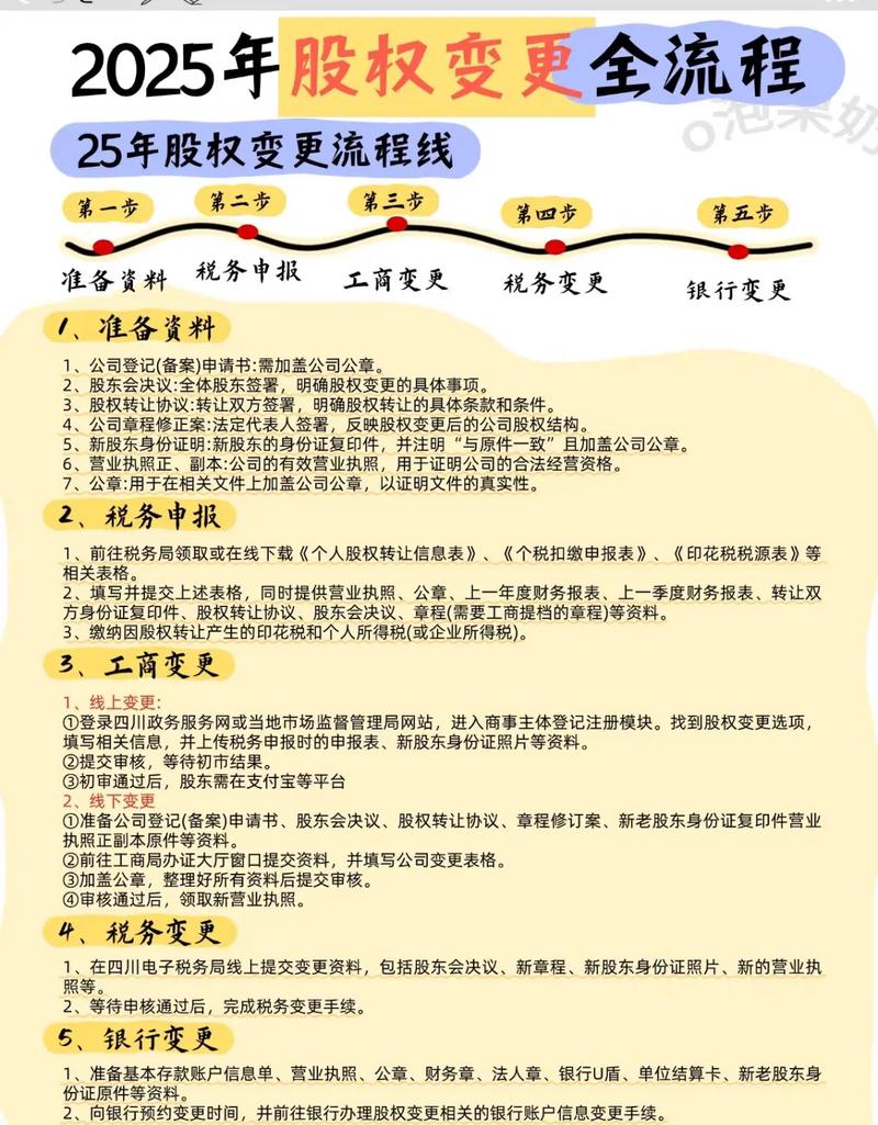 - 核心流程:内部决策 → 签署文件 → 办理工商变更登记 → (如适用)商务/商务部门备案。
