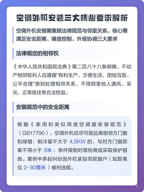 (图片来源网络,侵删)- 停止侵害、排除妨碍:如果空调外机安装位置不当,噪音、热气、冷凝水严重影响邻居,邻居可以向法院起诉,要求你停止使用、调整位置或采取降噪措施。