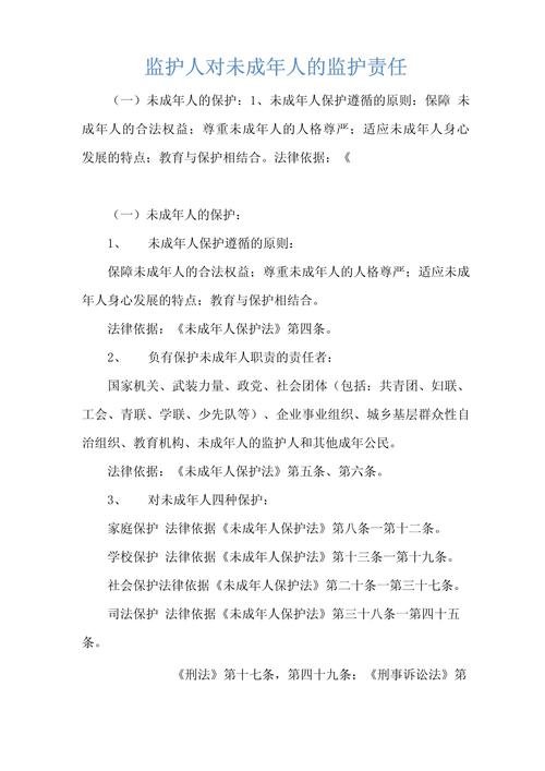 | 法律责任 | 监护人失职(如虐待、侵占财产)可能导致被撤销监护人资格,并承担赔偿责任。 |