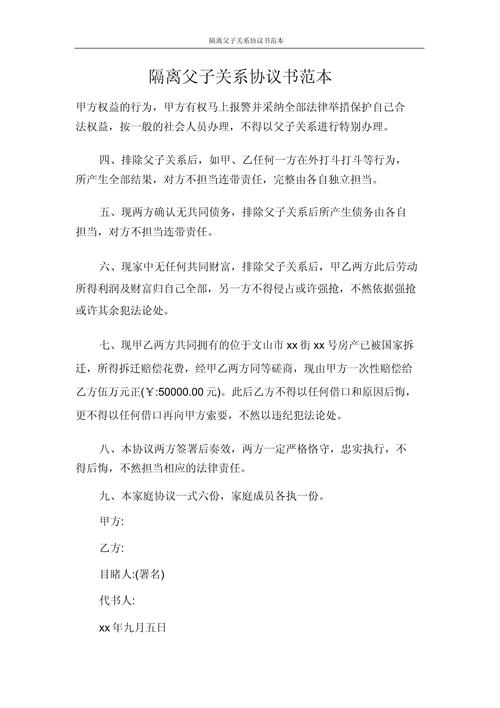 法律上能否与父亲断绝亲子关系? 核心结论先行在法律上,不存在“断绝父子关系”这一概念,父子关系是基于血缘而产生的自然血缘关系,这种关系是客观、永久、不可更改的,它不是一种可以通过合同或声明来解除的社会关系(如婚姻关系),任何形式的“断绝父子关系协议”在法律上都是无效的,法律上“断绝关系”到底是什么意思?虽然不能从法律上消灭血缘关系...